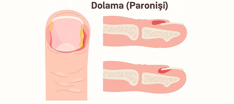 Dolama, tırnak çevresindeki derinin zarar görmesiyle gelişen bir enfeksiyondur. Bu bölgedeki cilt bariyerinin bozulması, bakterilerin, mantarların veya her ikisinin birden enfeksiyon oluşturmasına neden olabilir. Özellikle ellerin sık yıkanması, kimyasal maddelere maruz kalma veya tırnak bakımında yapılan hatalar dolama gelişimini kolaylaştırır. Altta yatan sistemik hastalıklar da riski artırır.